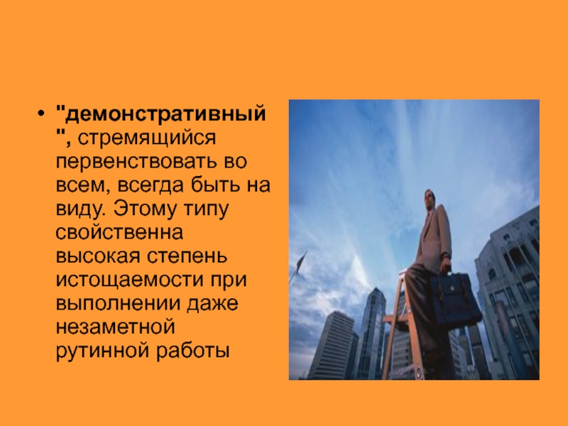 Слайд 10"демонстративный", стремящийся первенствовать во всем, всегда быть на виду. Этому типу