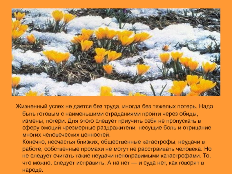 Конечно, несчастья близких, общественные катастрофы, неудачи в работе, собственные промахи не могут не расстраивать человека. Но не следует считать такие неудачи непоправимыми катастрофами. То, что можно, следует исправить. А на нет — и суда нет, как говорят в народе.