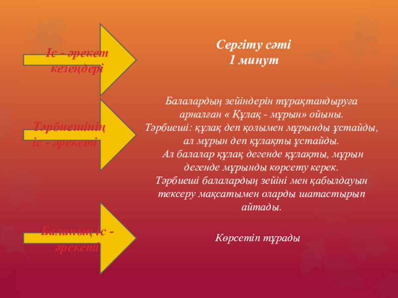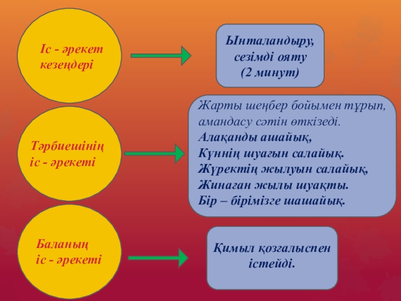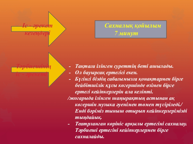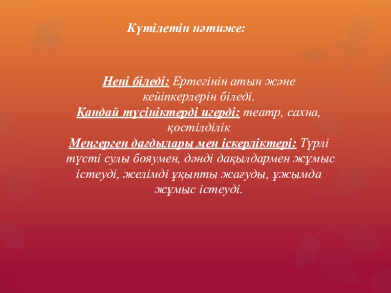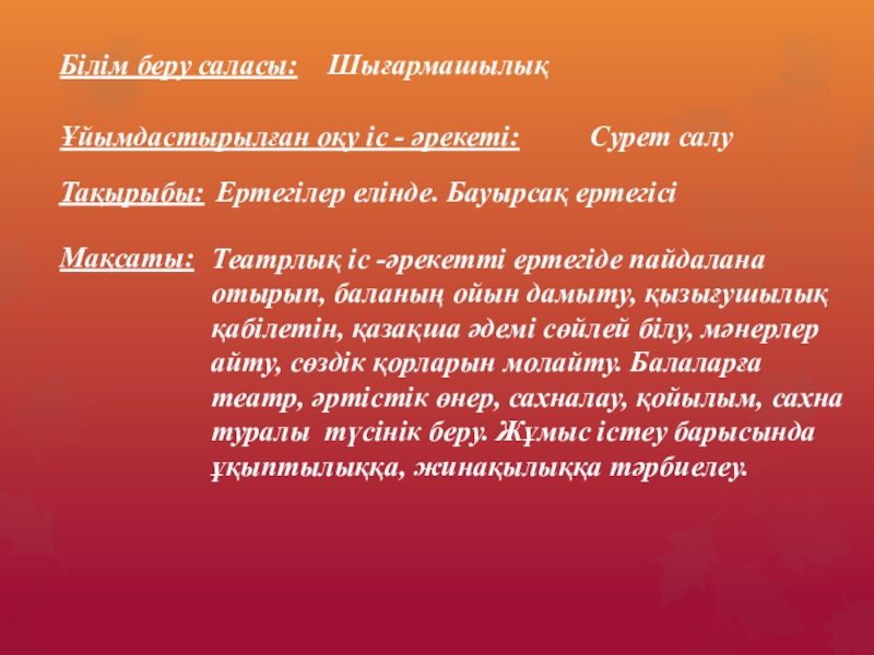 Театрлық іс -әрекетті ертегіде пайдалана отырып, баланың ойын дамыту, қызығушылық қабілетін, қазақша әдемі сөйлей білу, мәнерлер айту, сөздік қорларын молайту. Балаларға театр, әртістік өнер, сахналау, қойылым, сахна туралы түсінік беру. Жұмыс істеу барысында ұқыптылыққа, жинақылыққа тәрбиелеу.