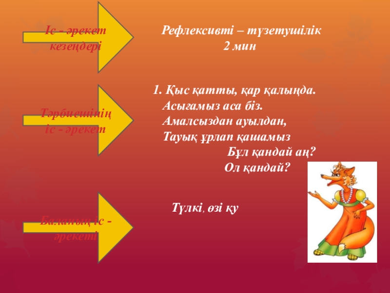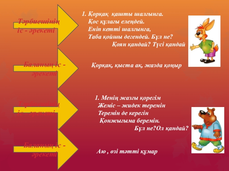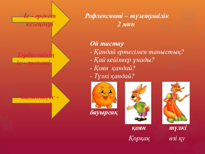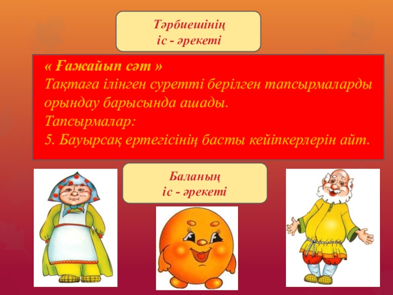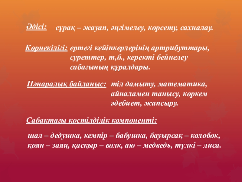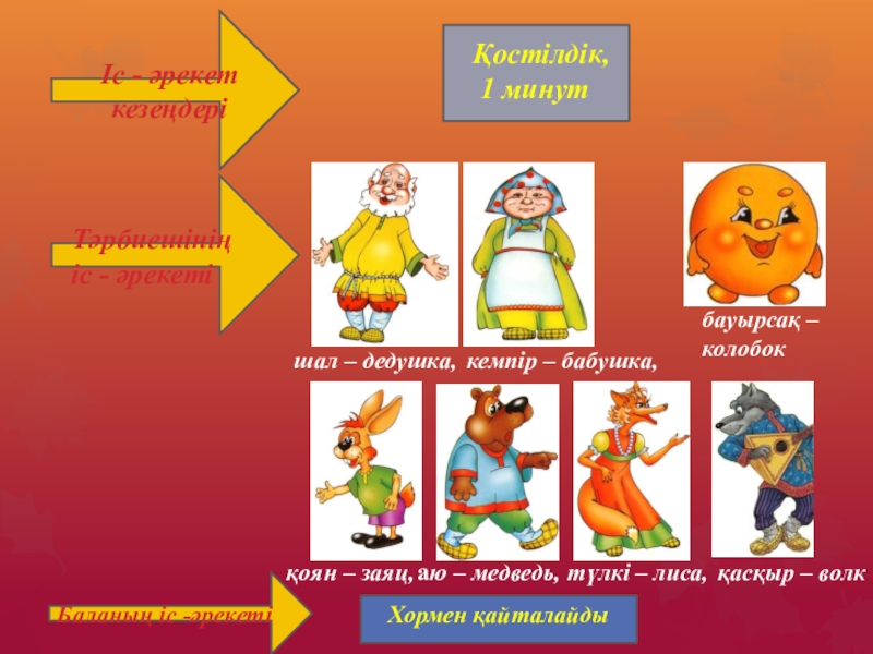 шал – дедушка, кемпір – бабушка, бауырсақ – колобок, қоян – заяц, қасқыр – волк, аю – медведь, түлкі – лиса.