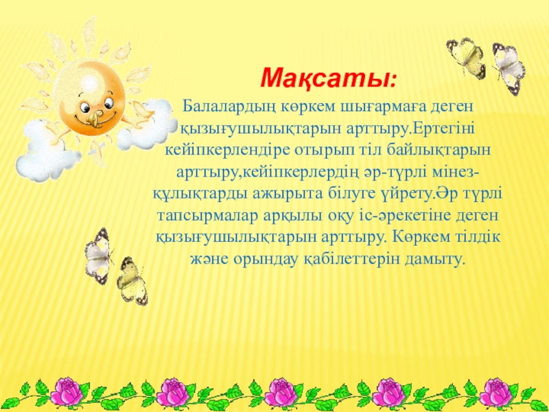 Мақсаты: Балалардың көркем шығармаға деген қызығушылықтарын арттыру.Ертегіні кейіпкерлендіре отырып тіл байлықтарын арттыру,кейіпкерлердің әр-түрлі мінез-құлықтарды ажырыта білуге үйрету.Әр түрлі
