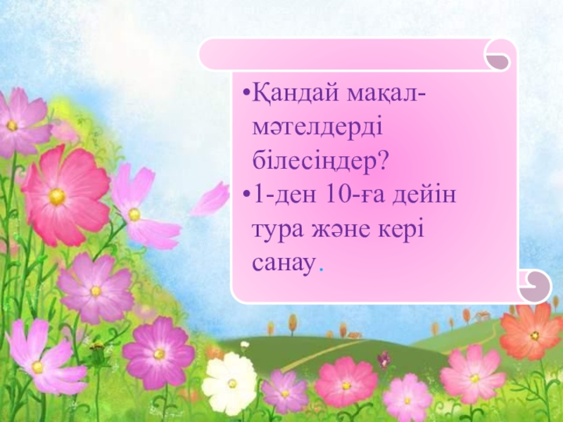 Қандай мақал-мәтелдерді білесіңдер?1-ден 10-ға дейін тура және кері санау.