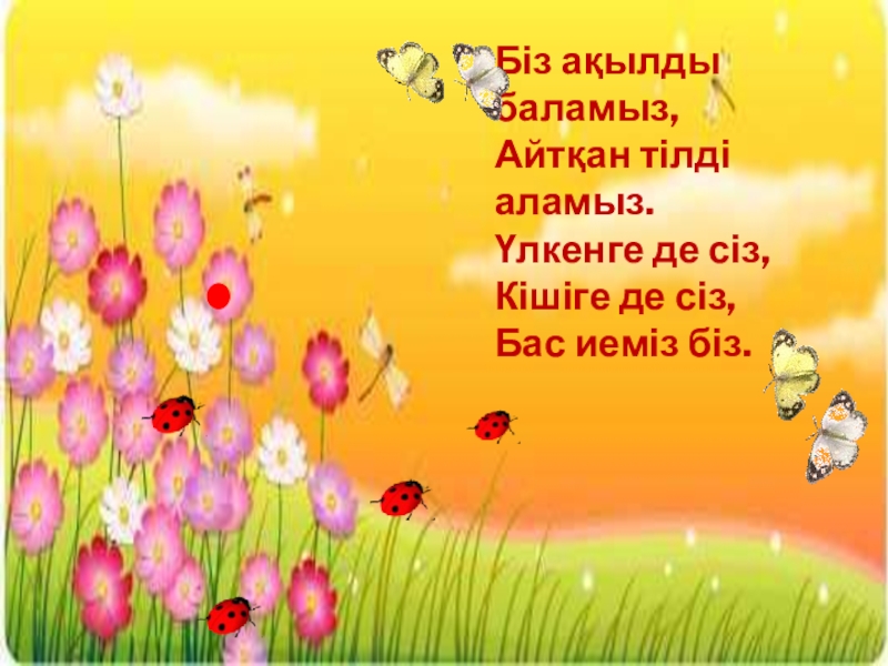 Біз ақылды баламыз,  Айтқан тілді аламыз.  Үлкенге де сіз,  Кішіге де сіз,  Бас иеміз біз.