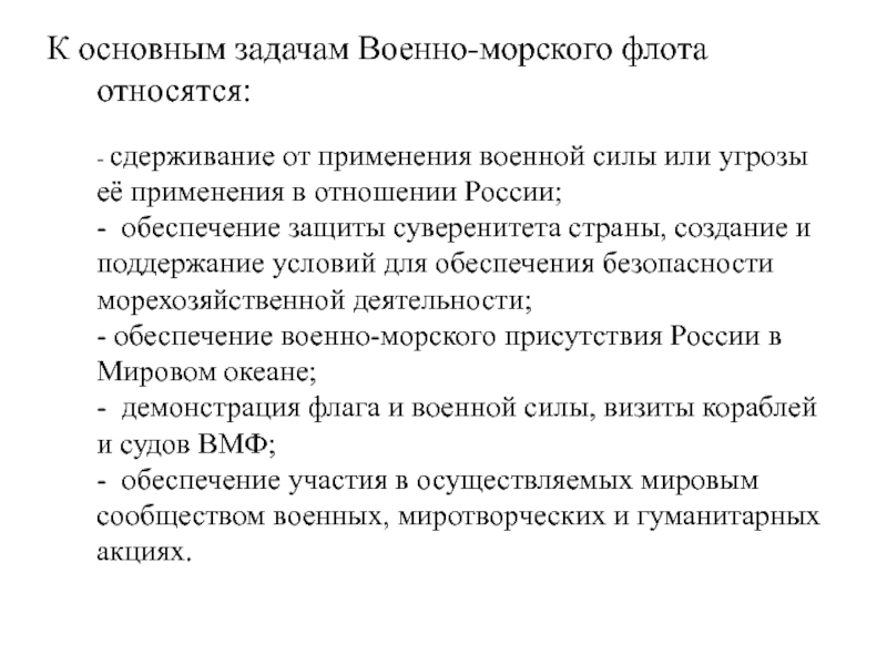 Слайд 8К основным задачам Военно-морского флота относятся: