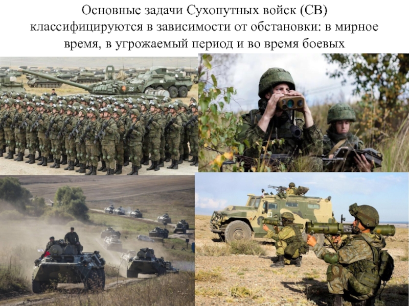 Слайд 6Основные задачи Сухопутных войск (СВ) классифицируются в зависимости от обстановки: в