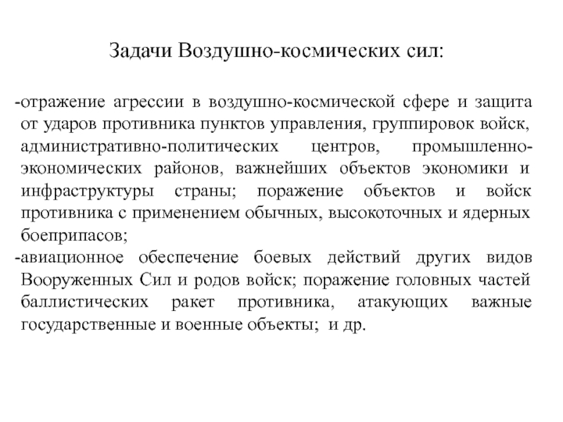 авиационное обеспечение боевых действий других видов Вооруженных Сил и родов войск; поражение головных частей баллистических ракет противника, атакующих важные государственные и военные объекты; и др.