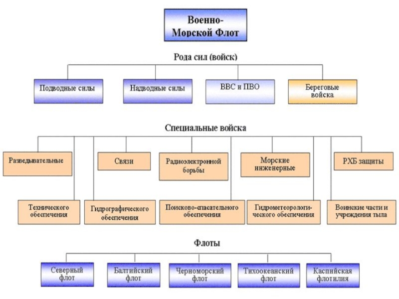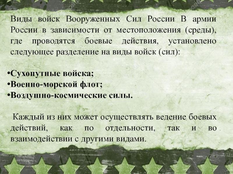 в зависимости от местоположения (среды), где проводятся боевые действия, установлено следующее разделение на виды войск (сил):