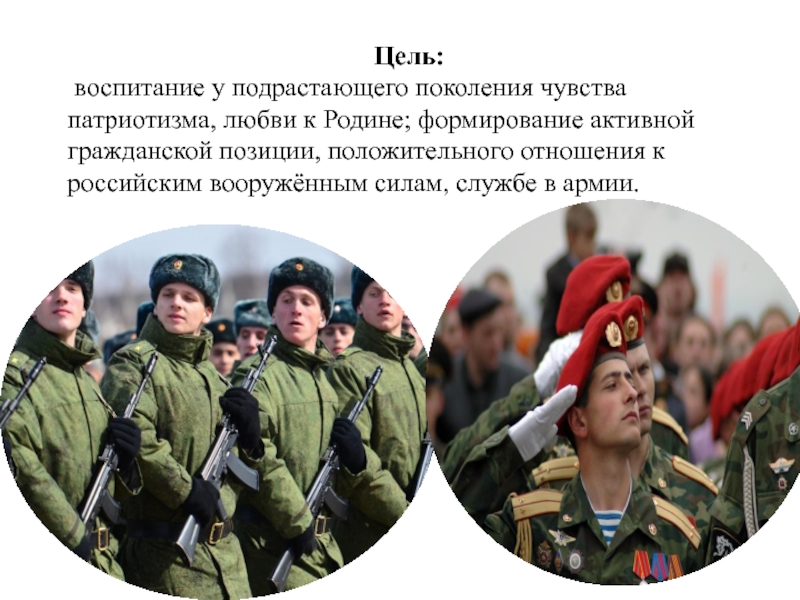 воспитание у подрастающего поколения чувства патриотизма, любви к Родине; формирование активной гражданской позиции, положительного отношения к российским вооружённым силам, службе в армии.