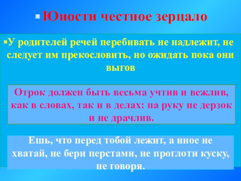 Отрок должен быть весьма учтив и вежлив, как в словах, так и в делах: на руку не дерзок и не драчлив.