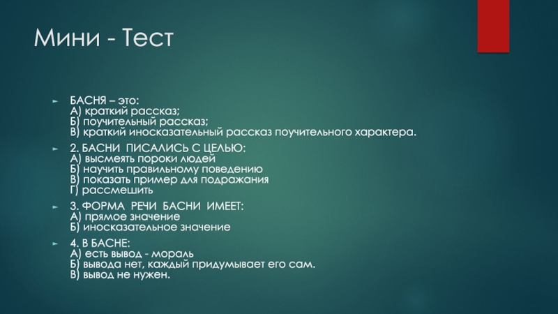 Мини - ТестБАСНЯ – это: А) краткий рассказ; Б) поучительный рассказ; В) краткий иносказательный рассказ поучительного характера.2.