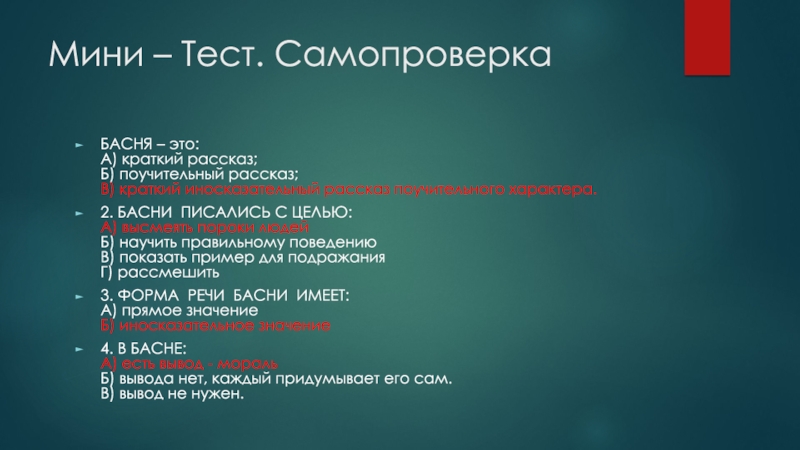 Мини – Тест. СамопроверкаБАСНЯ – это: А) краткий рассказ; Б) поучительный рассказ; В) краткий иносказательный рассказ поучительного