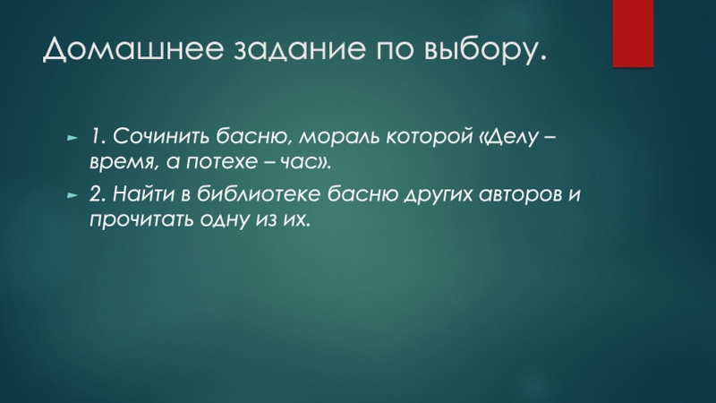 Домашнее задание по выбору.1. Сочинить басню, мораль которой «Делу – время, а потехе – час».2. Найти в