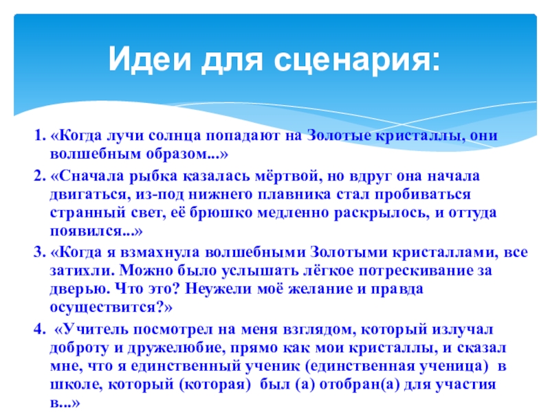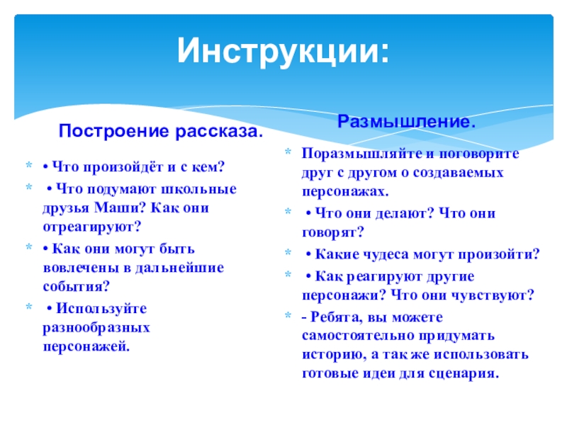 - Ребята, вы можете самостоятельно придумать историю, а так же использовать готовые идеи для сценария.