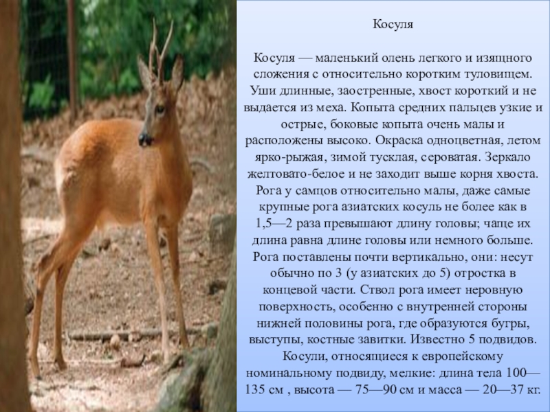 Косуля — маленький олень легкого и изящного сложения с относительно коротким