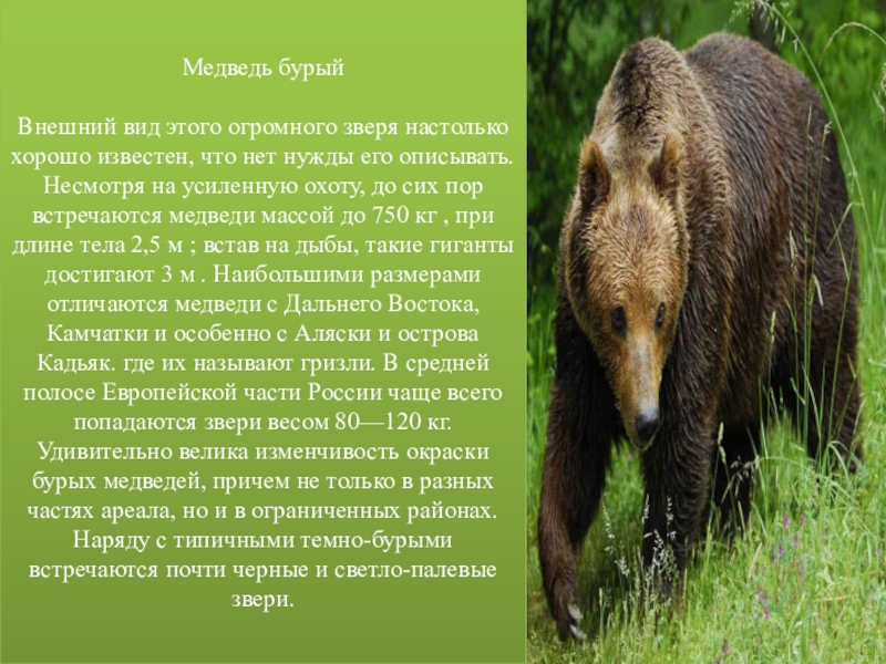 нужды его описывать. Несмотря на усиленную охоту, до сих пор встречаются медведи массой до 750 кг , при длине тела 2,5 м ; встав на дыбы, такие гиганты достигают 3 м . Наибольшими размерами отличаются медведи с Дальнего Востока, Камчатки и особенно с Аляски и острова Кадьяк. где их называют гризли. В средней полосе Европейской части России чаще всего попадаются звери весом 80—120 кг. Удивительно велика изменчивость окраски бурых медведей, причем не только в разных частях ареала, но и в ограниченных районах. Наряду с типичными темно-бурыми встречаются почти черные и светло-палевые звери.