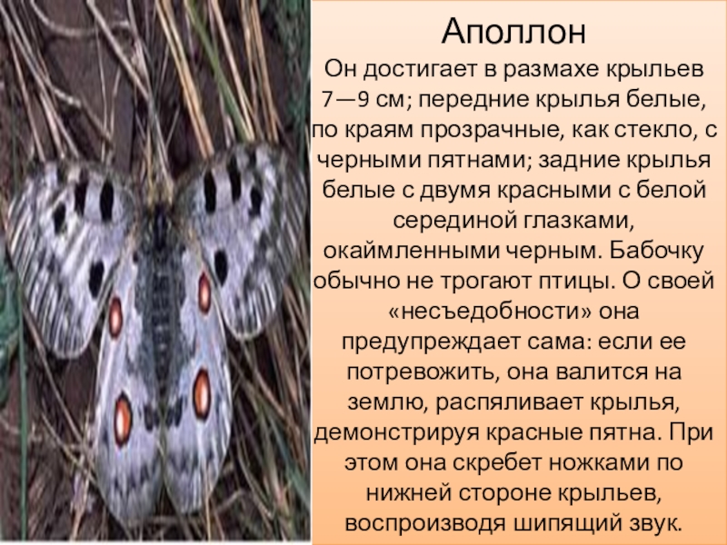 краям прозрачные, как стекло, с черными пятнами; задние крылья белые с двумя красными с белой серединой глазками, окаймленными черным. Бабочку обычно не трогают птицы. О своей «несъедобности» она предупреждает сама: если ее потревожить, она валится на землю, распяливает крылья, демонстрируя красные пятна. При этом она скребет ножками по нижней стороне крыльев, воспроизводя шипящий звук.