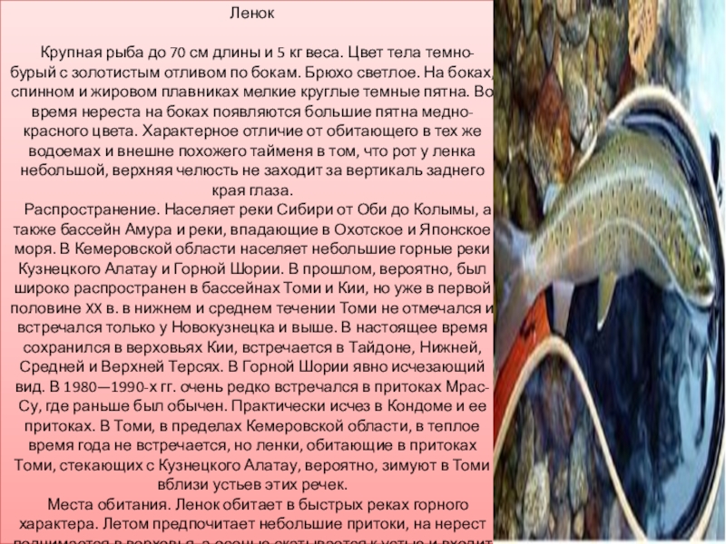 Места обитания. Ленок обитает в быстрых реках горного характера. Летом предпочитает небольшие притоки, на нерест поднимается в верховья, а осенью скатывается к устью и входит в русла более крупных рек, таких как Мрас-Су, Кия и Томь, где зимует в ямах.