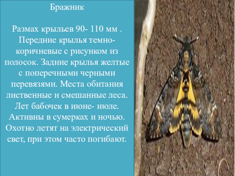 из полосок. Задние крылья желтые с поперечными черными перевязями. Места обитания лиственные и смешанные леса. Лет бабочек в июне- июле. Активны в сумерках и ночью. Охотно летят на электрический свет, при этом часто погибают.
