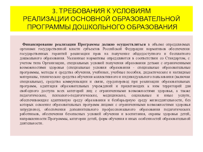 Программы должно осуществляться в объеме определяемых органами государственной власти субъектов Российской Федерации нормативов обеспечения государственных гарантий реализации прав на получение общедоступного и бесплатного дошкольного образования. Указанные нормативы определяются в соответствии со Стандартом, с учетом типа Организации, специальных условий получения образования детьми с ограниченными возможностями здоровья (специальные условия образования - специальные образовательные программы, методы и средства обучения, учебники, учебные пособия, дидактические и наглядные материалы, технические средства обучения коллективного и индивидуального пользования (включая специальные), средства коммуникации и связи, сурдоперевод при реализации образовательных программ, адаптация образовательных учреждений и прилегающих к ним территорий для свободного доступа всех категорий лиц с ограниченными возможностями здоровья, а также педагогические, психолого-педагогические, медицинские, социальные и иные услуги, обеспечивающие адаптивную среду образования и безбарьерную среду жизнедеятельности, без которых освоение образовательных программ лицами с ограниченными возможностями здоровья затруднено), обеспечения дополнительного профессионального образования педагогических работников, обеспечения безопасных условий обучения и воспитания, охраны здоровья детей, направленности Программы, категории детей, форм обучения и иных особенностей образовательной деятельности.