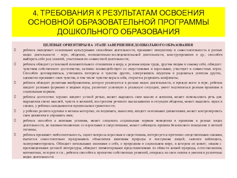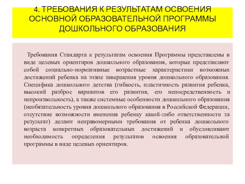 к результатам освоения Программы представлены в виде целевых ориентиров дошкольного образования, которые представляют собой социально-нормативные возрастные характеристики возможных достижений ребенка на этапе завершения уровня дошкольного образования. Специфика дошкольного детства (гибкость, пластичность развития ребенка, высокий разброс вариантов его развития, его непосредственность и непроизвольность), а также системные особенности дошкольного образования (необязательность уровня дошкольного образования в Российской Федерации, отсутствие возможности вменения ребенку какой-либо ответственности за результат) делают неправомерными требования от ребенка дошкольного возраста конкретных образовательных достижений и обусловливают необходимость определения результатов освоения образовательной программы в виде целевых ориентиров.
