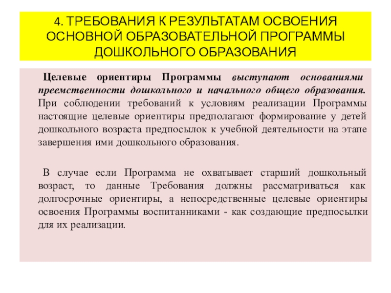 В случае если Программа не охватывает старший дошкольный возраст, то данные Требования должны рассматриваться как долгосрочные ориентиры, а непосредственные целевые ориентиры освоения Программы воспитанниками - как создающие предпосылки для их реализации.