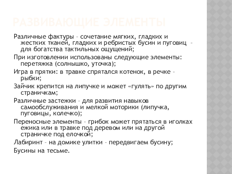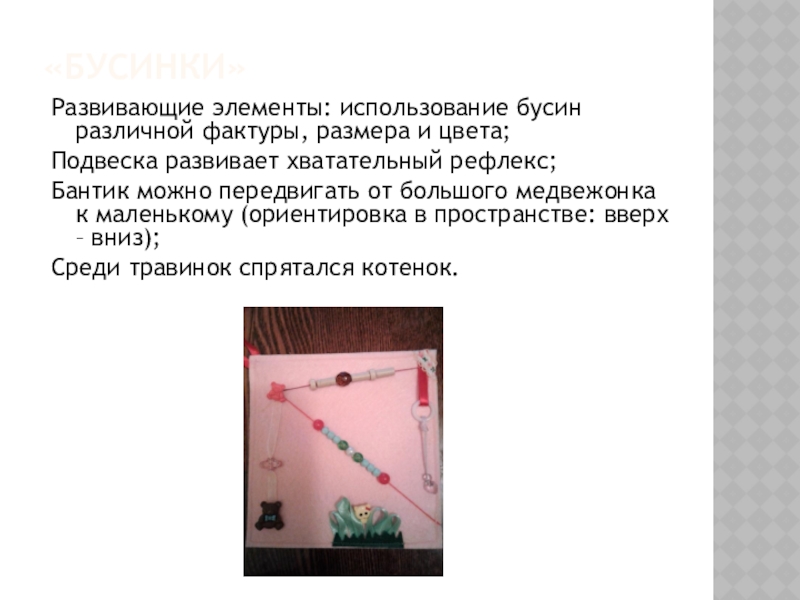 Развивающие элементы: использование бусин различной фактуры, размера и цвета;
