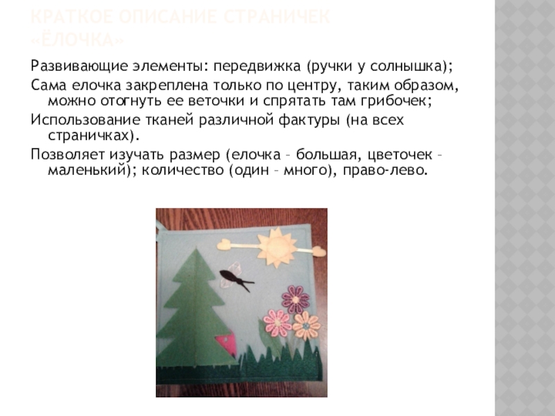 Позволяет изучать размер (елочка – большая, цветочек – маленький); количество (один – много), право-лево.