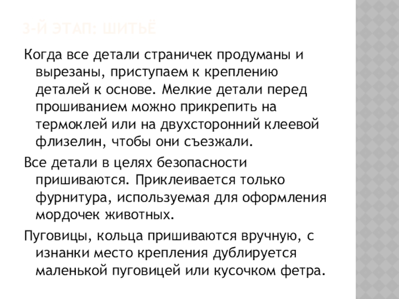 Все детали в целях безопасности пришиваются. Приклеивается только фурнитура, используемая для оформления мордочек животных.
