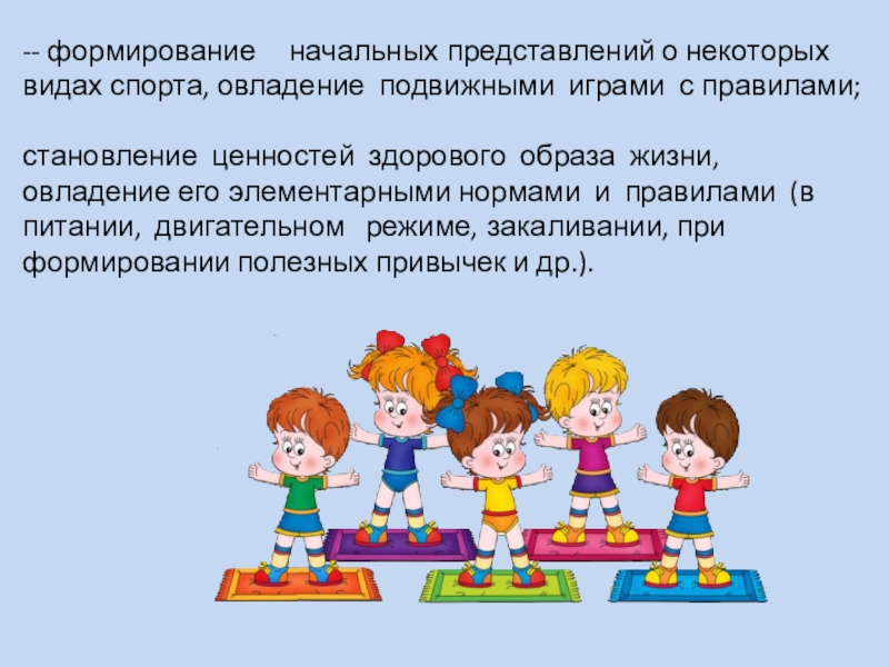 Слайд 16-- формирование начальных представлений о некоторых видах спорта, овладение