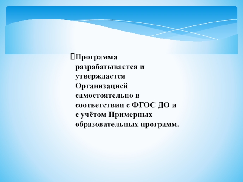 Слайд 4Программа разрабатывается и утверждается Организацией самостоятельно в соответствии с ФГОС ДО