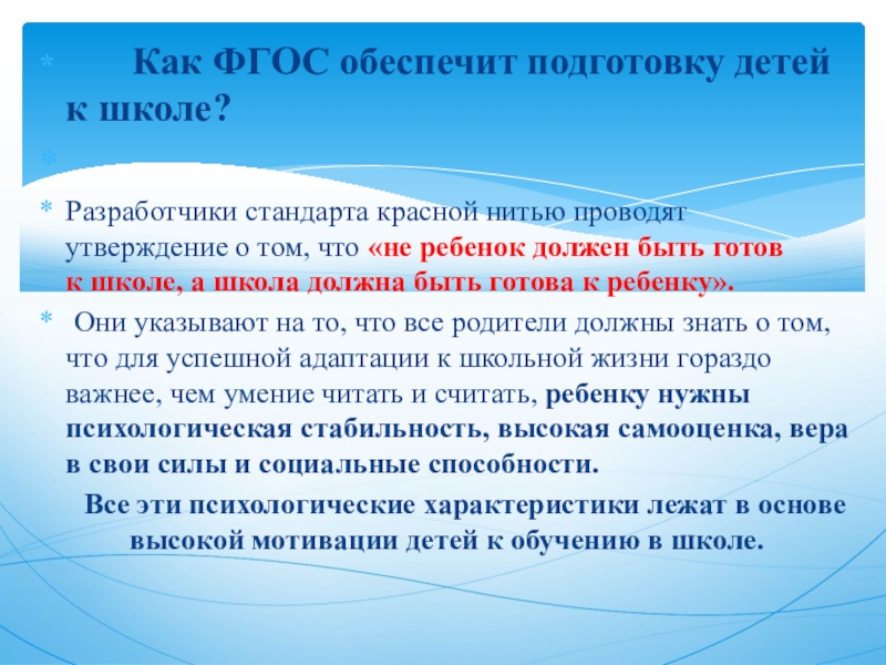 Разработчики стандарта красной нитью проводят утверждение о том, что «не ребенок должен быть готов к школе, а школа должна быть готова к ребенку».