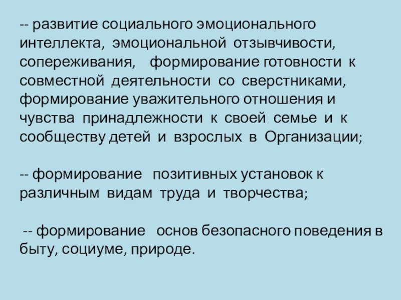 Слайд 12-- развитие социального эмоционального интеллекта, эмоциональной отзывчивости, сопереживания, формирование готовности