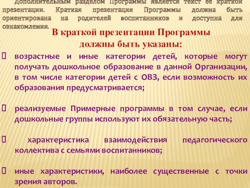 Дополнительным разделом Программы является текст её краткой презентации. Краткая презентация Программы должна быть ориентирована на родителей воспитанников и доступна для ознакомления.
