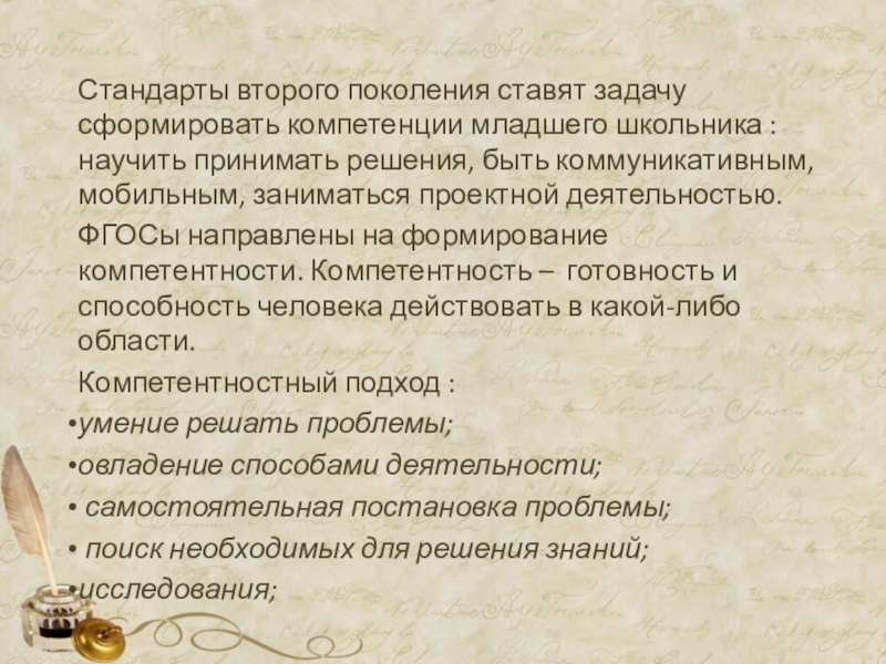 Слайд 4Стандарты второго поколения ставят задачу сформировать компетенции младшего школьника : научить