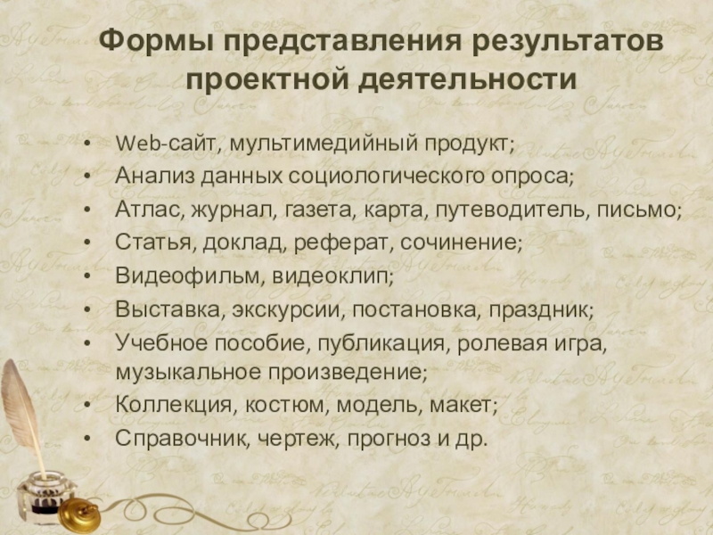 Учебное пособие, публикация, ролевая игра, музыкальное произведение;