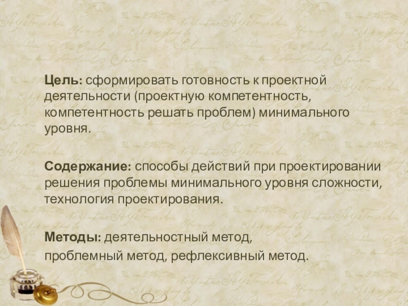 Слайд 5Цель: сформировать готовность к проектной деятельности (проектную компетентность, компетентность решать проблем)