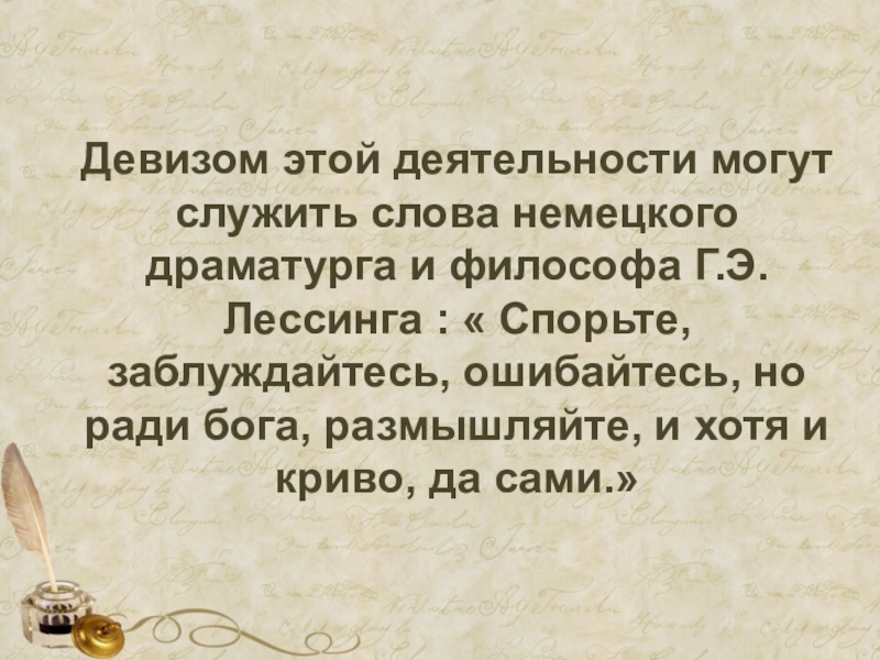 Слайд 12Девизом этой деятельности могут служить слова немецкого драматурга и философа Г.Э.