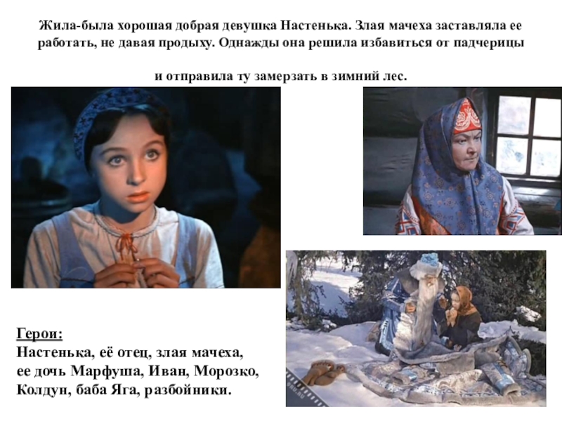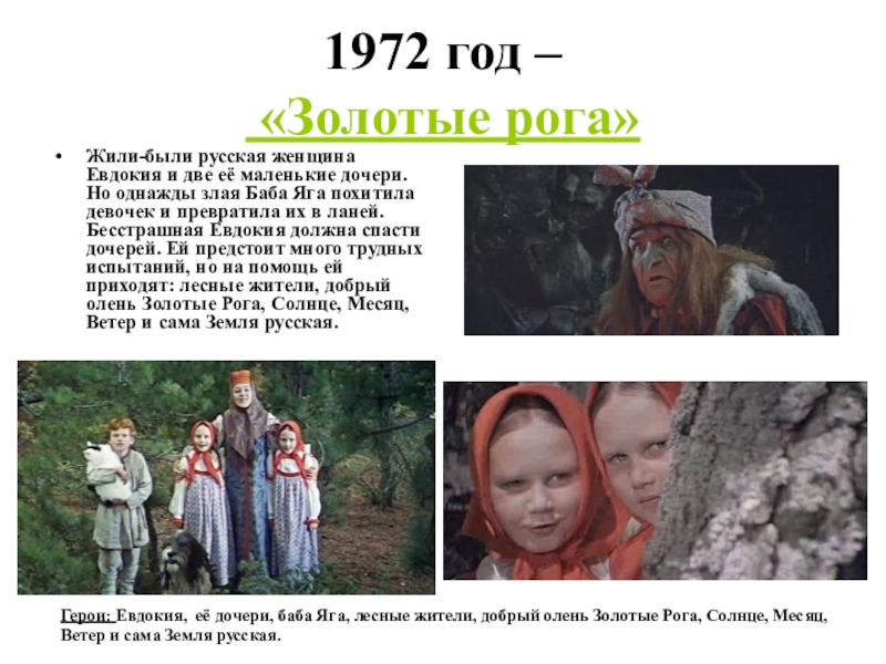 Герои: Евдокия, её дочери, баба Яга, лесные жители, добрый олень Золотые Рога, Солнце, Месяц, Ветер и сама Земля русская.