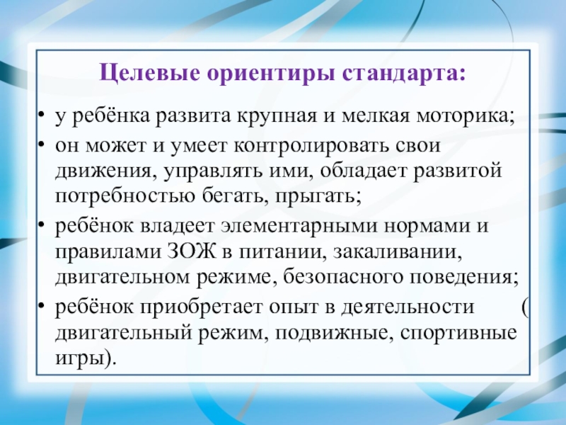 совершенствование форм и функций организма ребёнка, формирование двигательных умений, навыков, знаний, воспитание физических качеств, формирование привычек ЗОЖ.