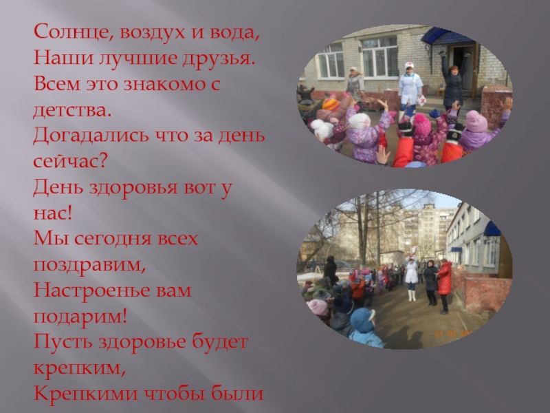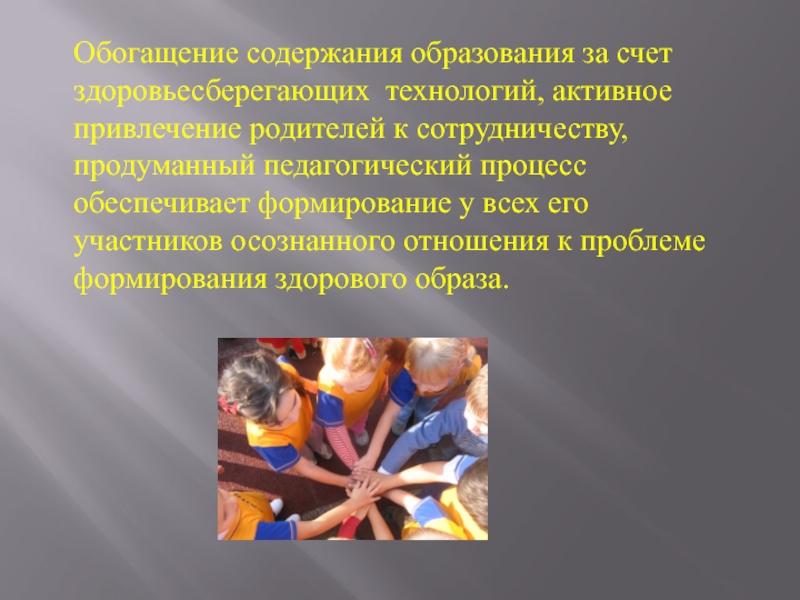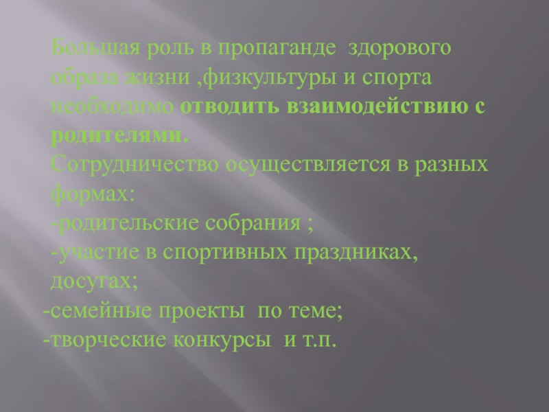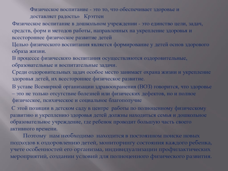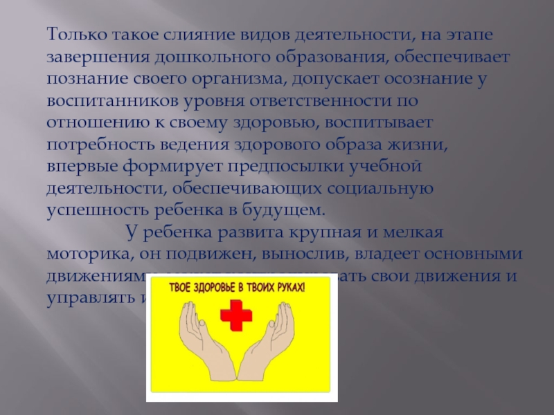 С этой позиции в детском саду в центре работы по полноценному физическому развитию и укреплению здоровья детей должны находиться семья и дошкольное образовательное учреждение, где ребенок проводит большую часть своего активного времени.
