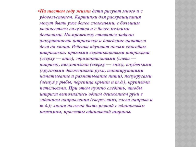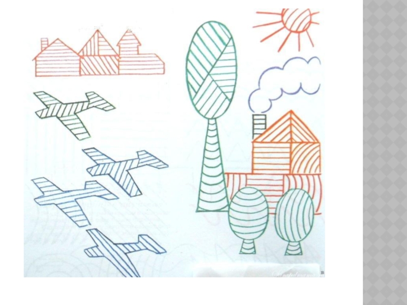 для раскрашивания могут быть уже более сложными, с большим количеством силуэтов и с более мелкими деталями. По-прежнему ставятся задачи: аккуратность штриховки и доведение начатого дела до конца. Ребенка обучают новым способам штриховки: прямыми вертикальными штрихами (сверху — вниз), горизонтальными (слева — направо), наклонными (сверху — вниз), клубочками (круговыми движениями руки, имитирующими наматывание и разматывание нити), полукругами (чешуя у рыбы, черепица крыши и т.д.), крупными петельками. При этом нужно следить, чтобы штрихи выполнялись одним движением руки в заданном направлении (сверху вниз, слева направо и т.д.); линия должна быть ровной с одинаковым нажимом, просветы одинаковой ширины.