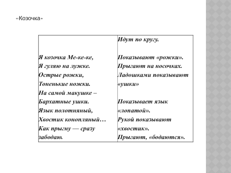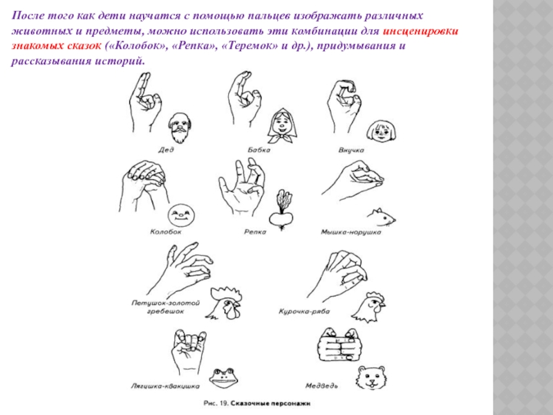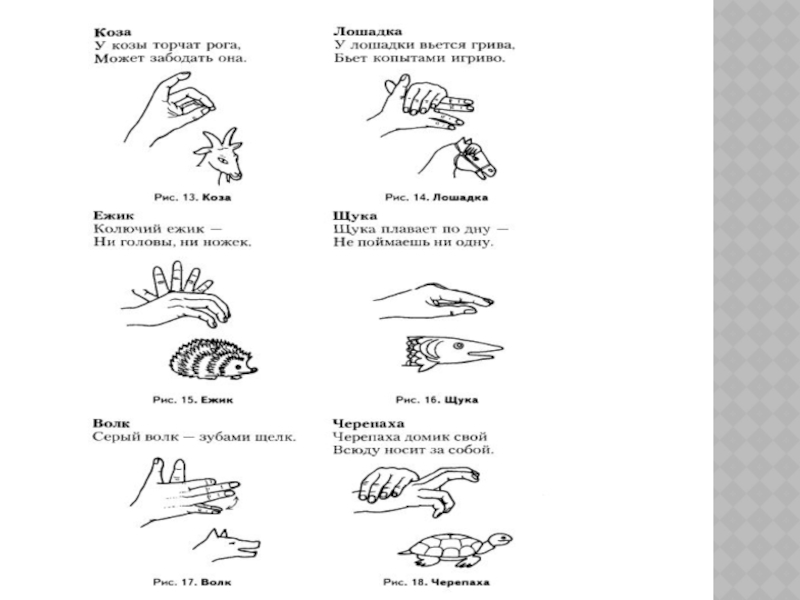 помощью разнообразных комбинаций пальцев рук изображать животных, людей и предметы. Для того чтобы вызвать и поддержать интерес к игре, используют стихи и поговорки.