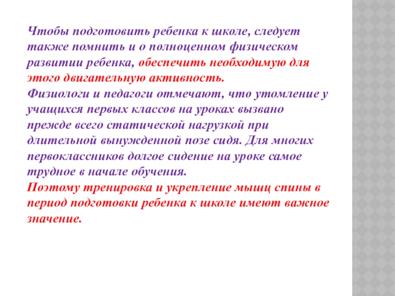 Физиологи и педагоги отмечают, что утомление у учащихся первых классов на уроках вызвано прежде всего статической нагрузкой при длительной вынужденной позе сидя. Для многих первоклассников долгое сидение на уроке самое трудное в начале обучения. Поэтому тренировка и укрепление мышц спины в период подготовки ребенка к школе имеют важное значение.