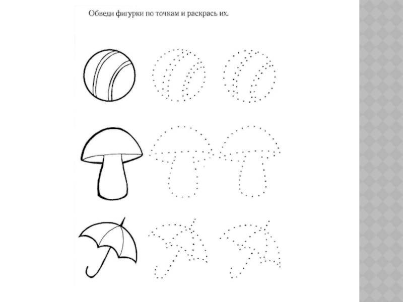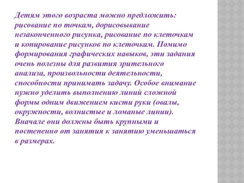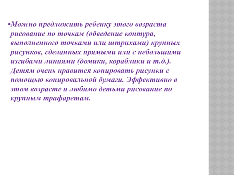 Слайд 45Детям этого возраста можно предложить: рисование по точкам, дорисовывание незаконченного рисунка,