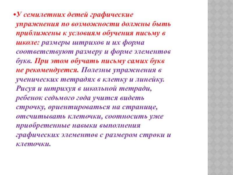 условиям обучения письму в школе: размеры штрихов и их форма соответствуют размеру и форме элементов букв. При этом обучать письму самих букв не рекомендуется. Полезны упражнения в ученических тетрадях в клетку и линейку. Рисуя и штрихуя в школьной тетради, ребенок седьмого года учится видеть строчку, ориентироваться на странице, отсчитывать клеточки, соотносить уже приобретенные навыки выполнения графических элементов с размером строки и клеточки.