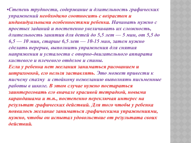 Слайд 61Степень трудности, содержание и длительность графических упражнений необходимо соотносить с возрастом