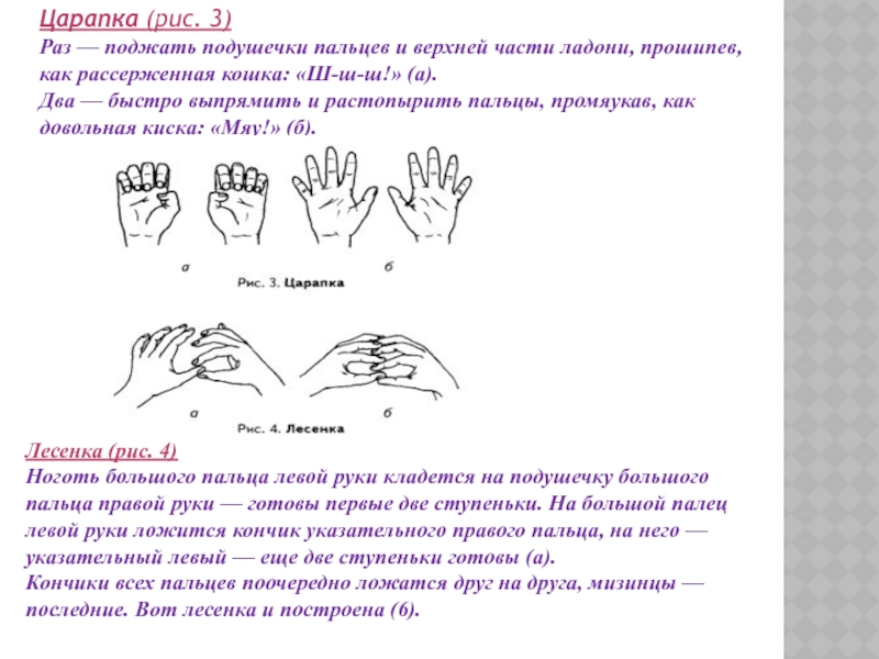 Ноготь большого пальца левой руки кладется на подушечку большого пальца правой руки — готовы первые две ступеньки. На большой палец левой руки ложится кончик указательного правого пальца, на него — указательный левый — еще две ступеньки готовы (а).