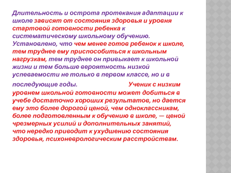 и уровня стартовой готовности ребенка к систематическому школьному обучению. Установлено, что чем менее готов ребенок к школе, тем труднее ему приспособиться к школьным нагрузкам, тем труднее он привыкает к школьной жизни и тем больше вероятность низкой успеваемости не только в первом классе, но и в последующие годы. Ученик с низким уровнем школьной готовности может добиться в учебе достаточно хороших результатов, но дается ему это более дорогой ценой, чем одноклассникам, более подготовленным к обучению в школе, — ценой чрезмерных усилий и дополнительных занятий, что нередко приводит к ухудшению состояния здоровья, психоневрологическим расстройствам.
