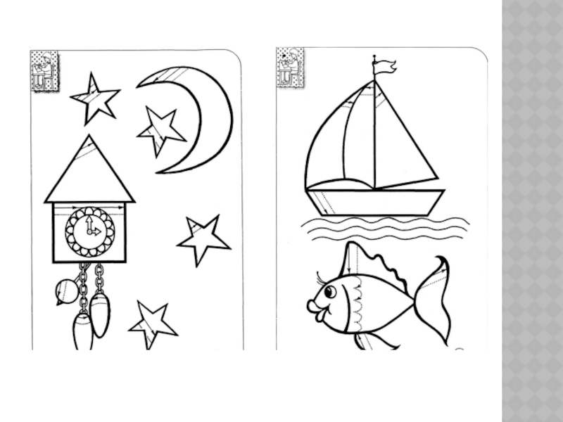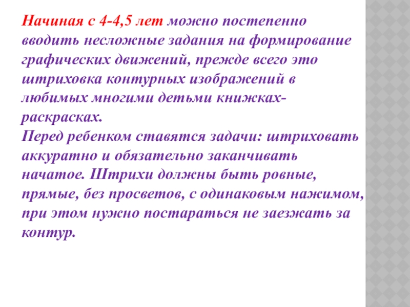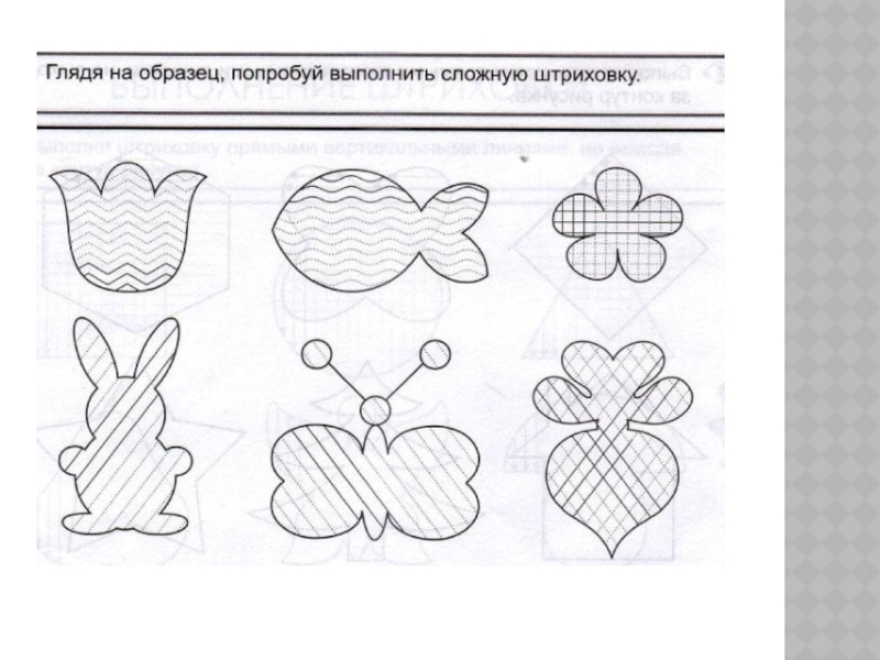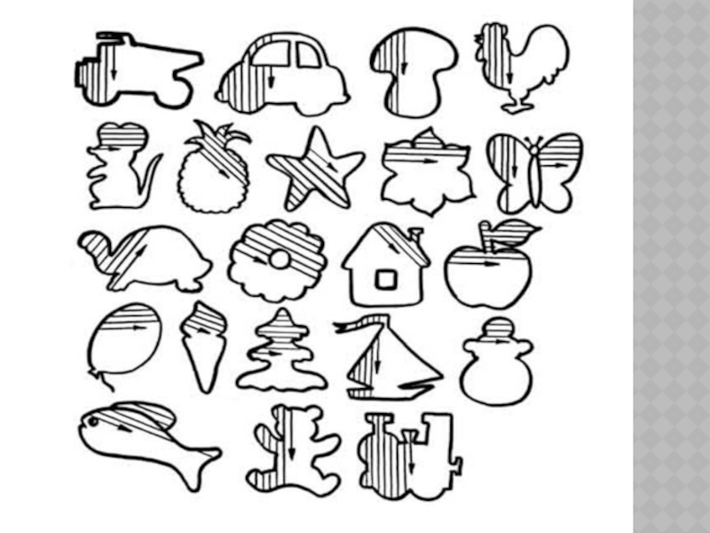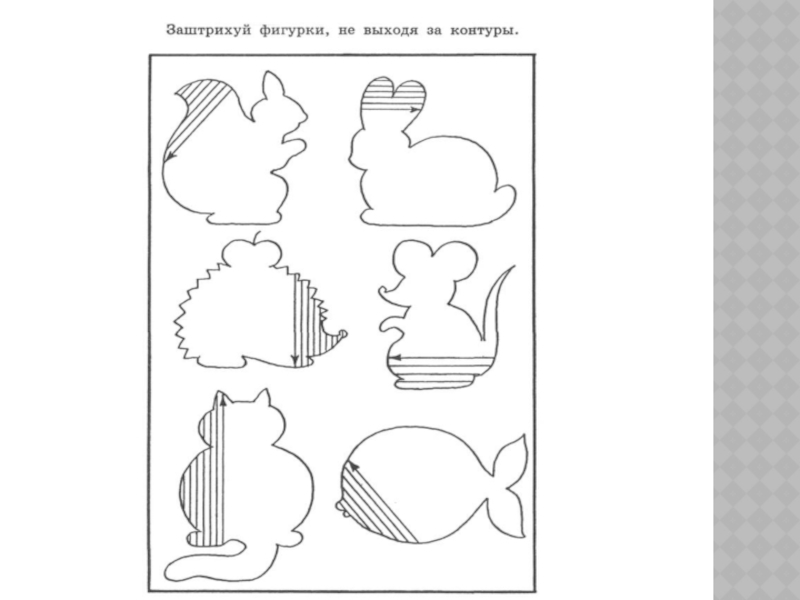 графических движений, прежде всего это штриховка контурных изображений в любимых многими детьми книжках-раскрасках. Перед ребенком ставятся задачи: штриховать аккуратно и обязательно заканчивать начатое. Штрихи должны быть ровные, прямые, без просветов, с одинаковым нажимом, при этом нужно постараться не заезжать за контур.
