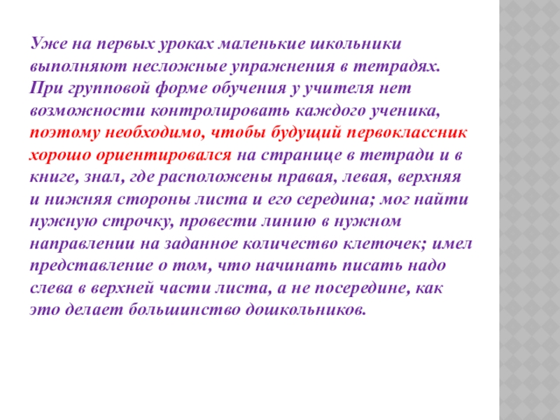 При групповой форме обучения у учителя нет возможности контролировать каждого ученика, поэтому необходимо, чтобы будущий первоклассник хорошо ориентировался на странице в тетради и в книге, знал, где расположены правая, левая, верхняя и нижняя стороны листа и его середина; мог найти нужную строчку, провести линию в нужном направлении на заданное количество клеточек; имел представление о том, что начинать писать надо слева в верхней части листа, а не посередине, как это делает большинство дошкольников.